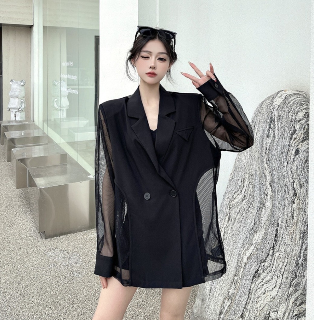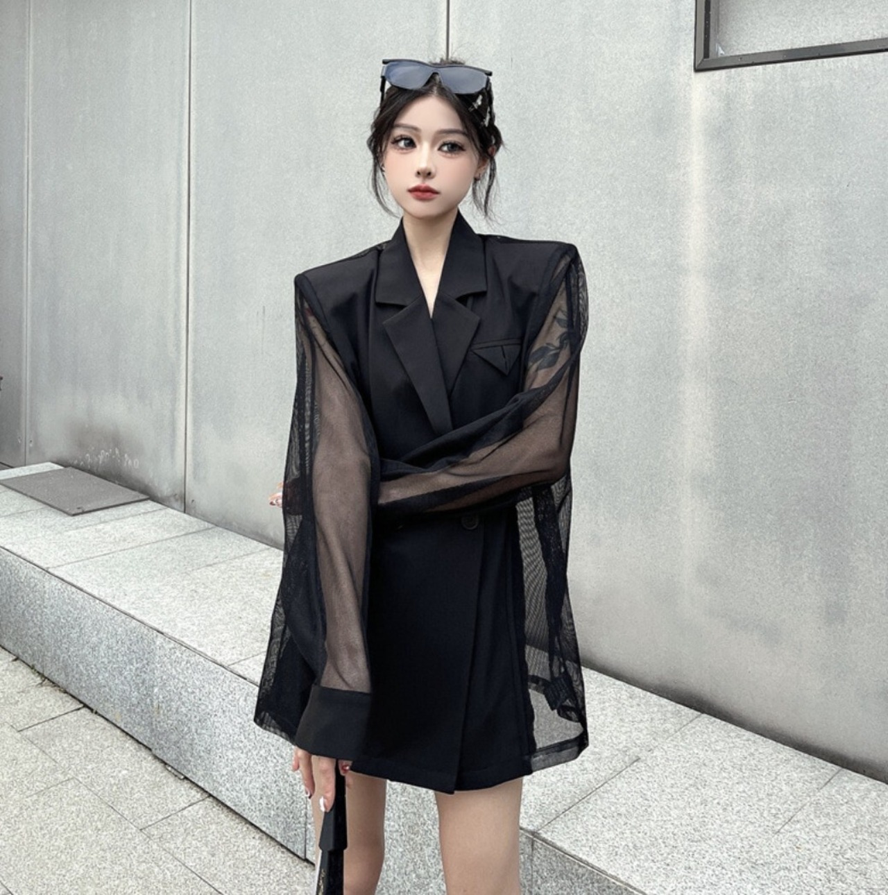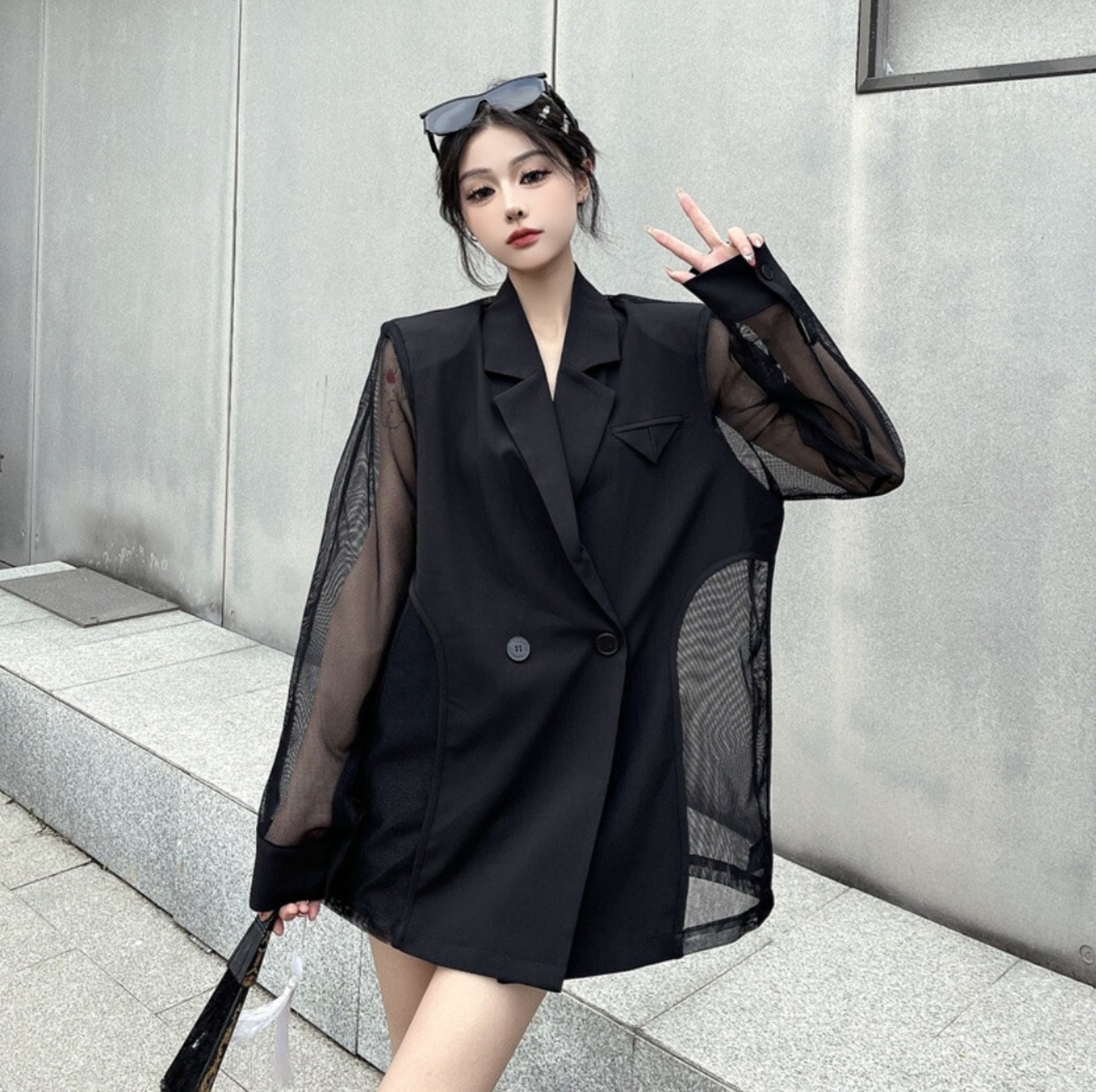 テーラードジャケットをベースに、袖と背面をシアー素材で切り替えたブラックジャケット。