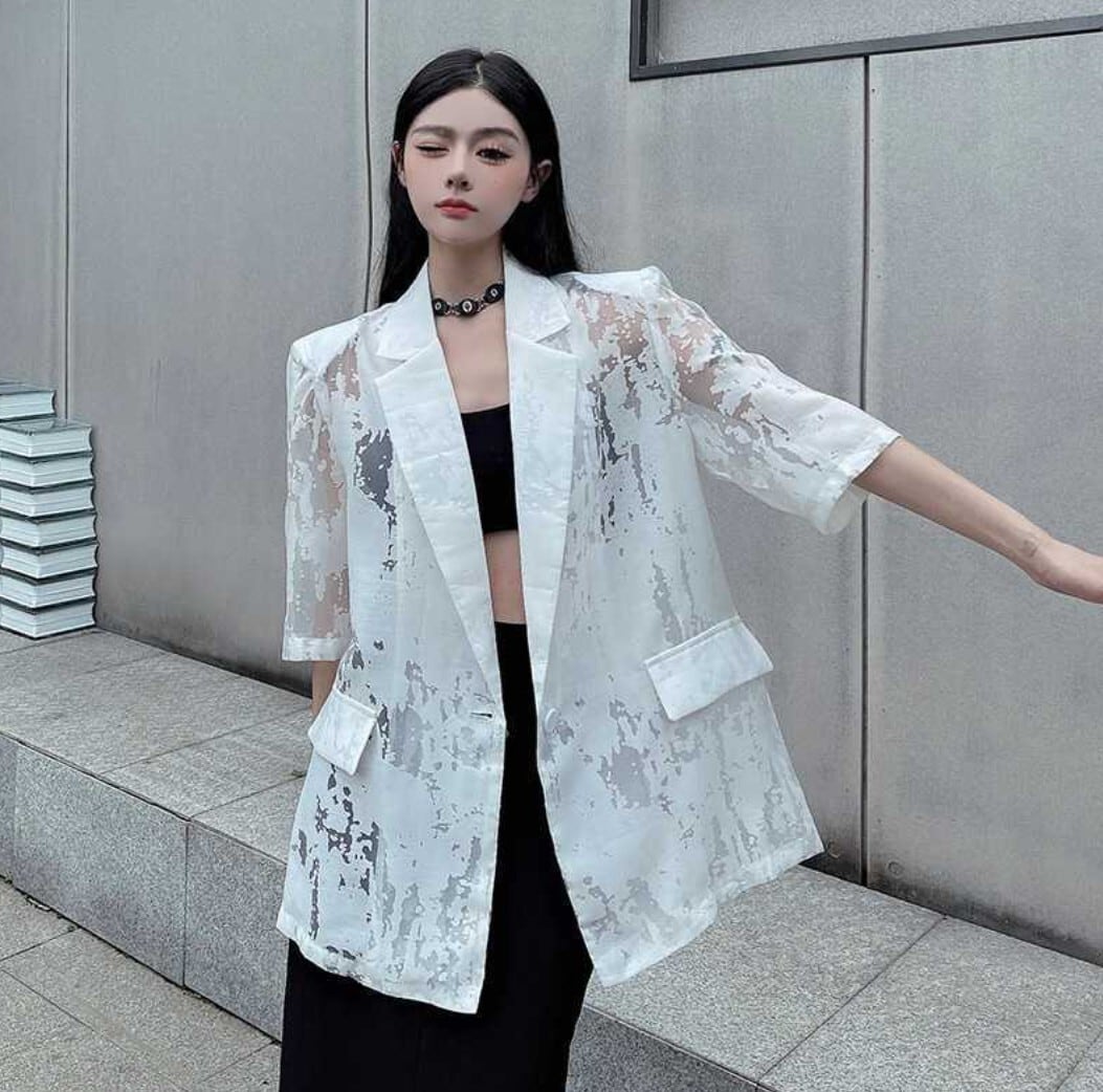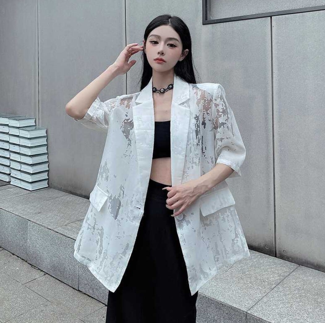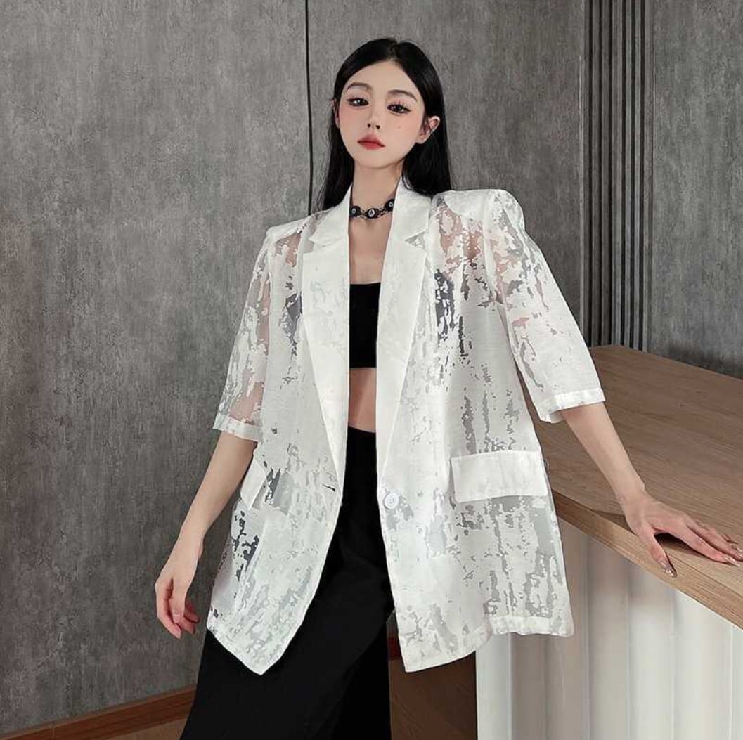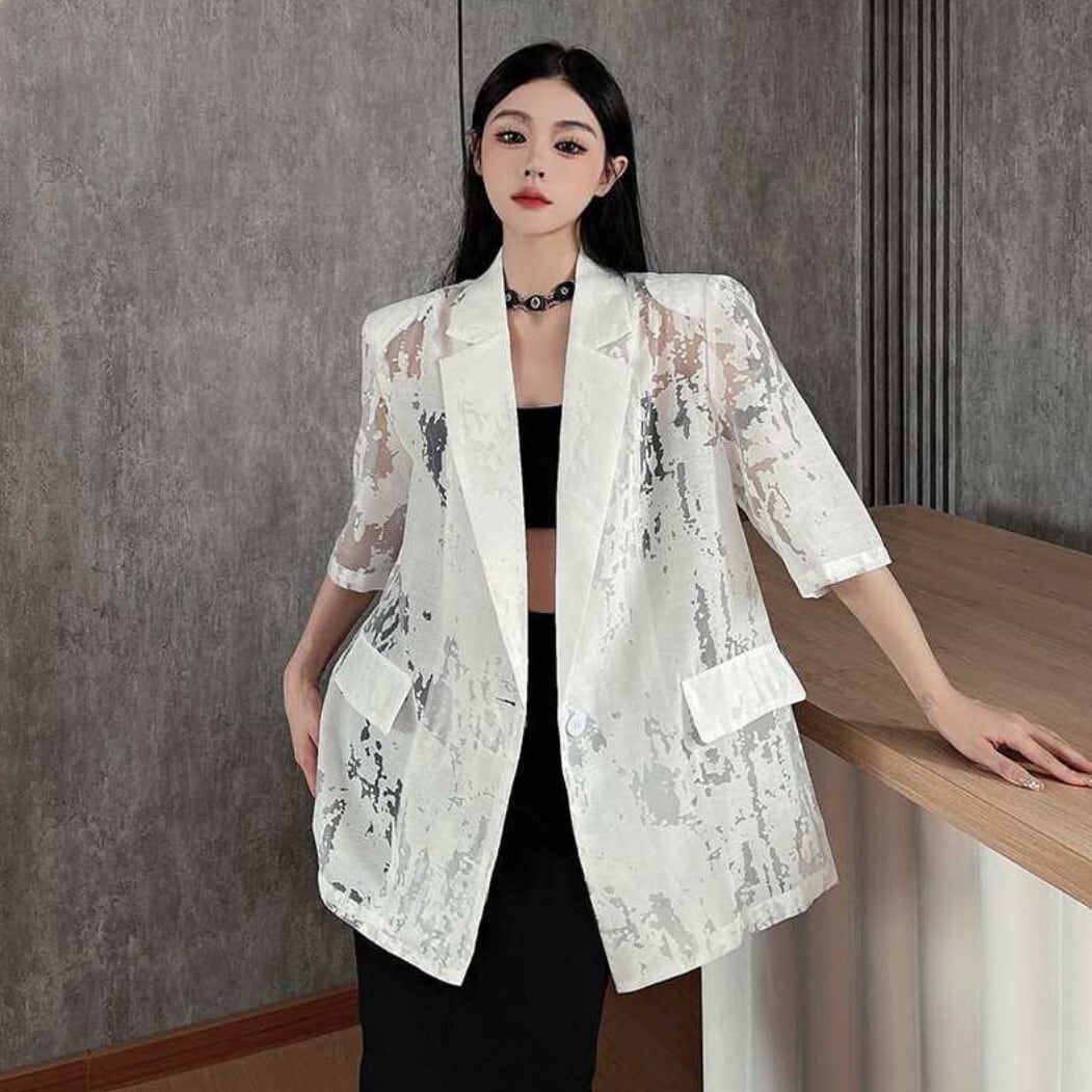 軽やかな透け感とジャカード調の柄感が印象的な、シアーテーラードジャケット。