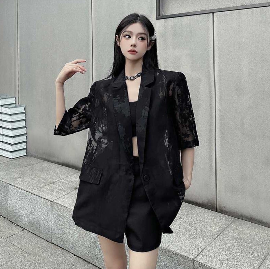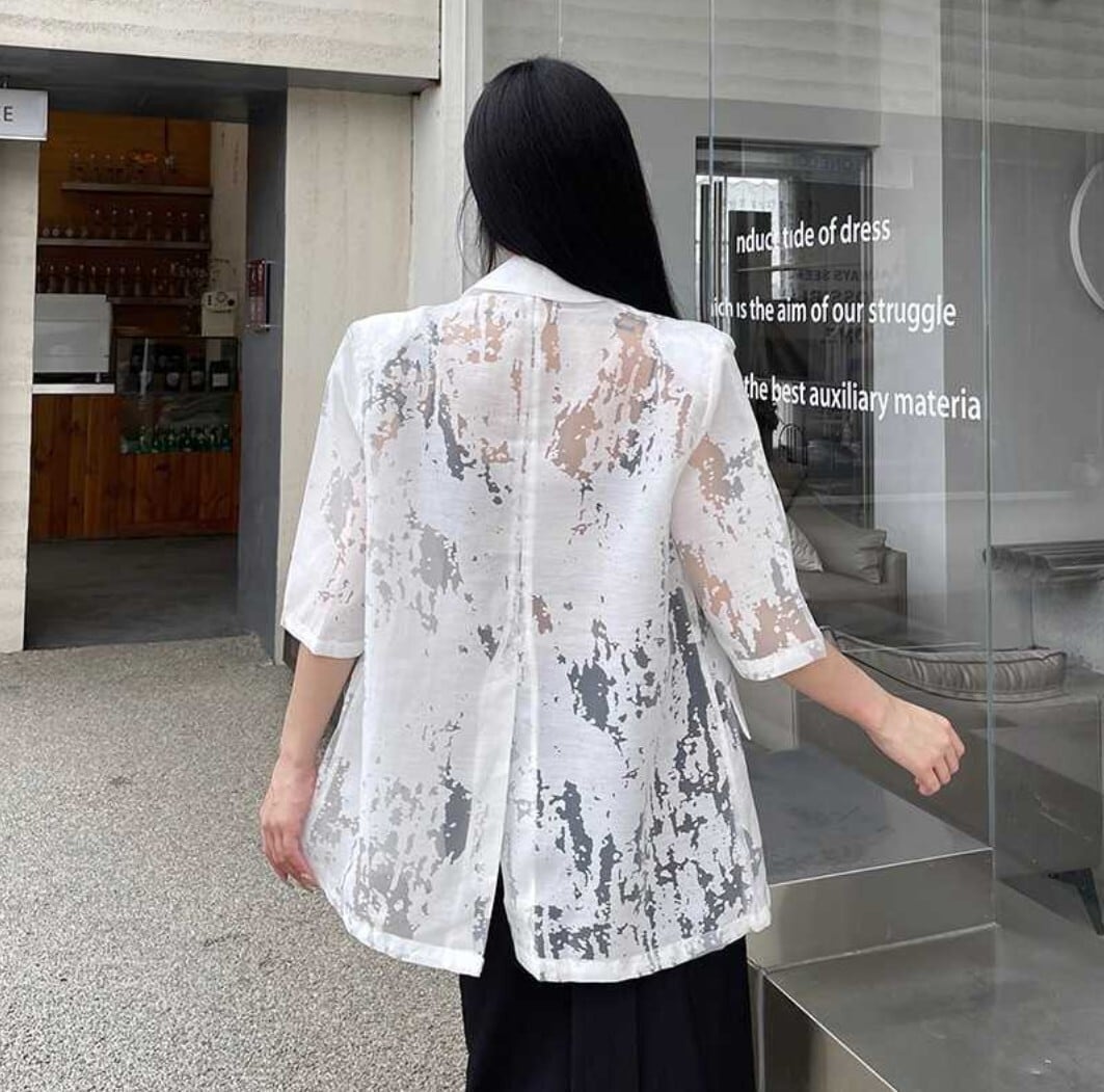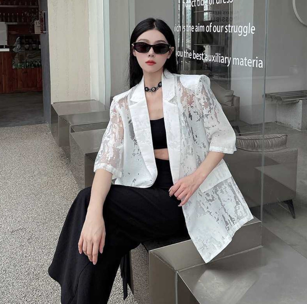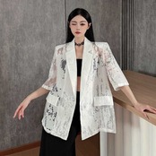 軽やかな透け感とジャカード調の柄感が印象的な、シアーテーラードジャケット。
