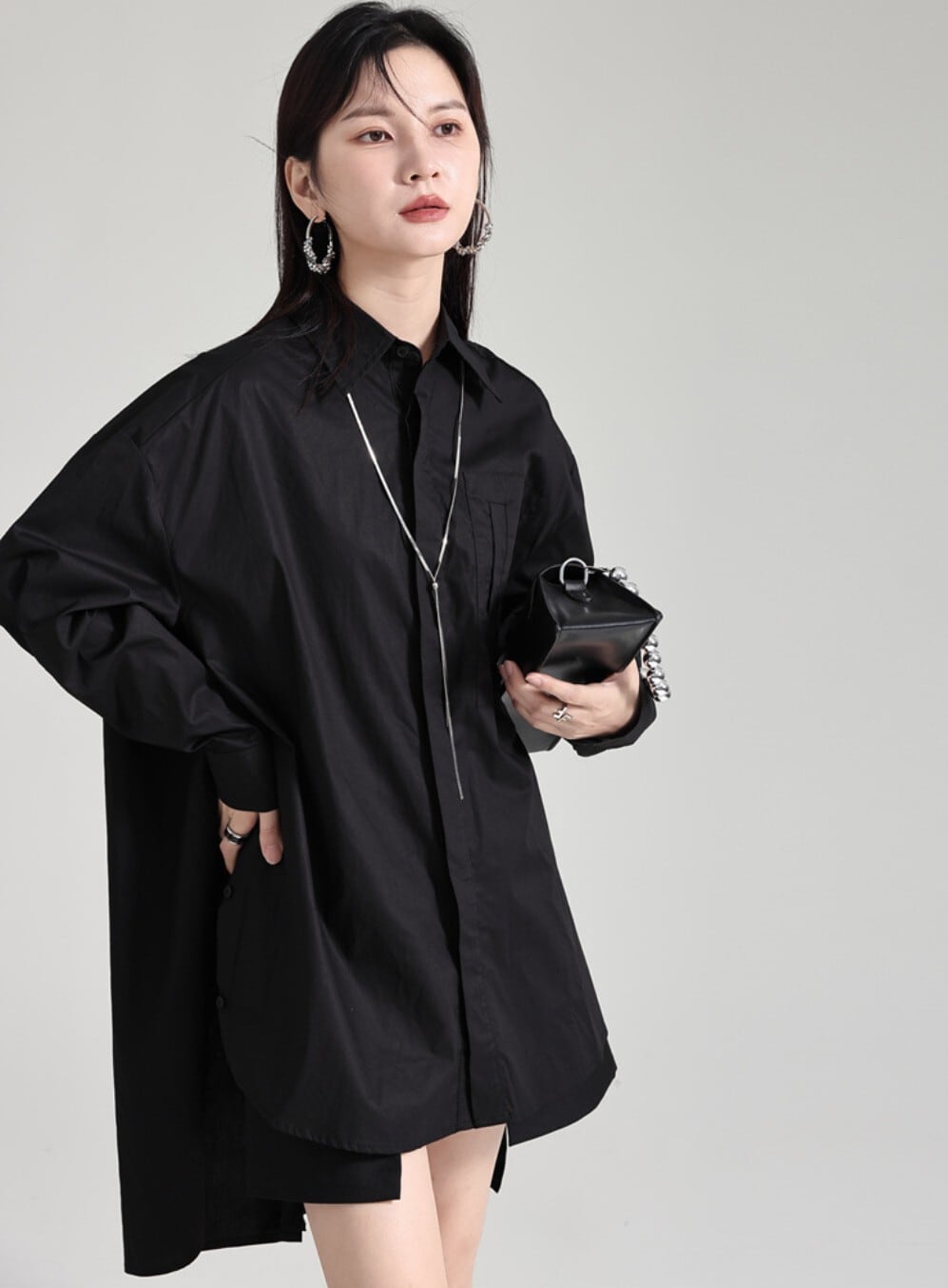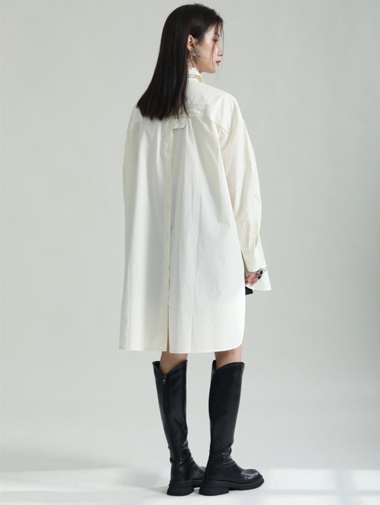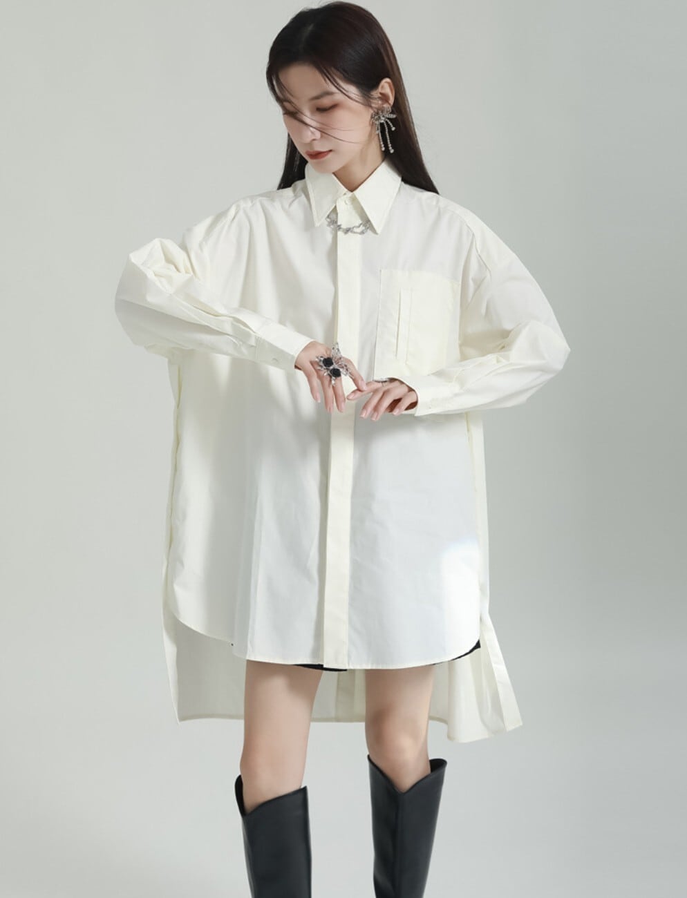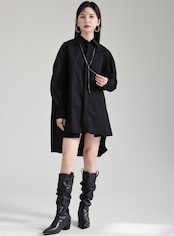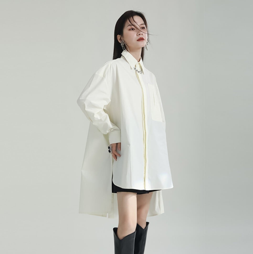 前後差のある丈感が特徴の、オーバーサイズロングシャツ。