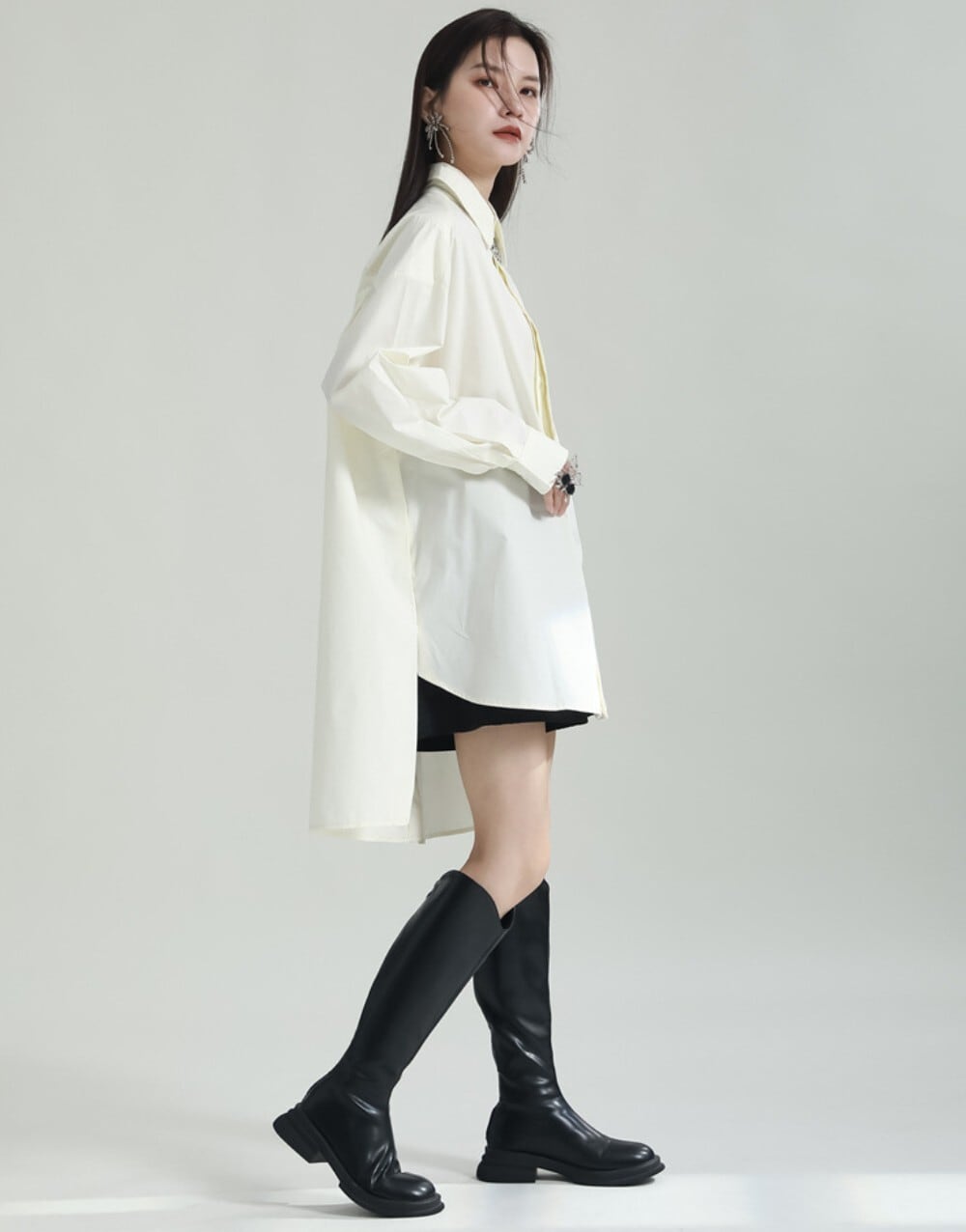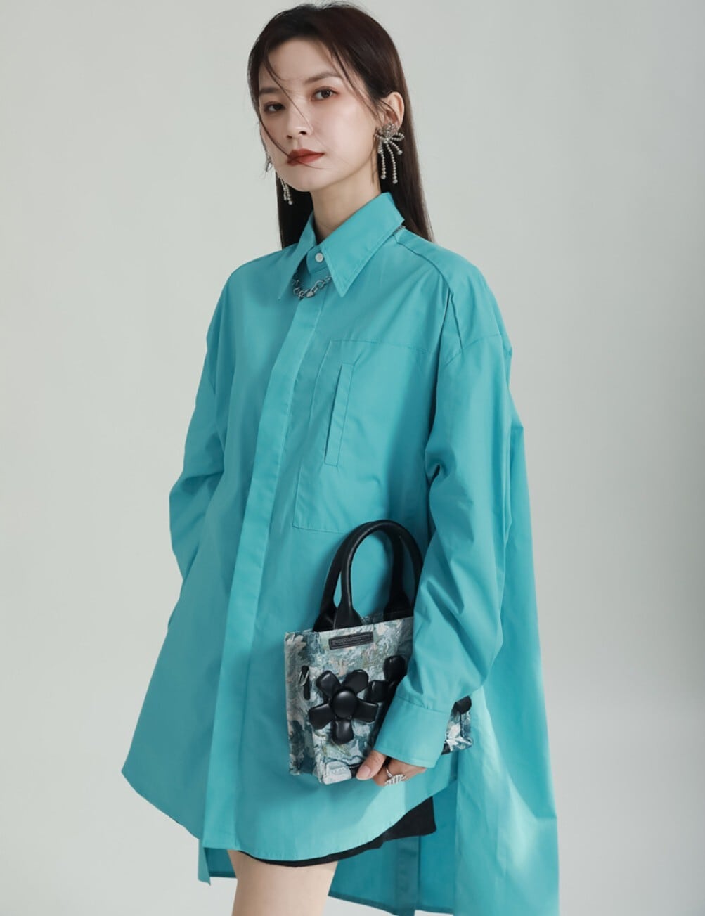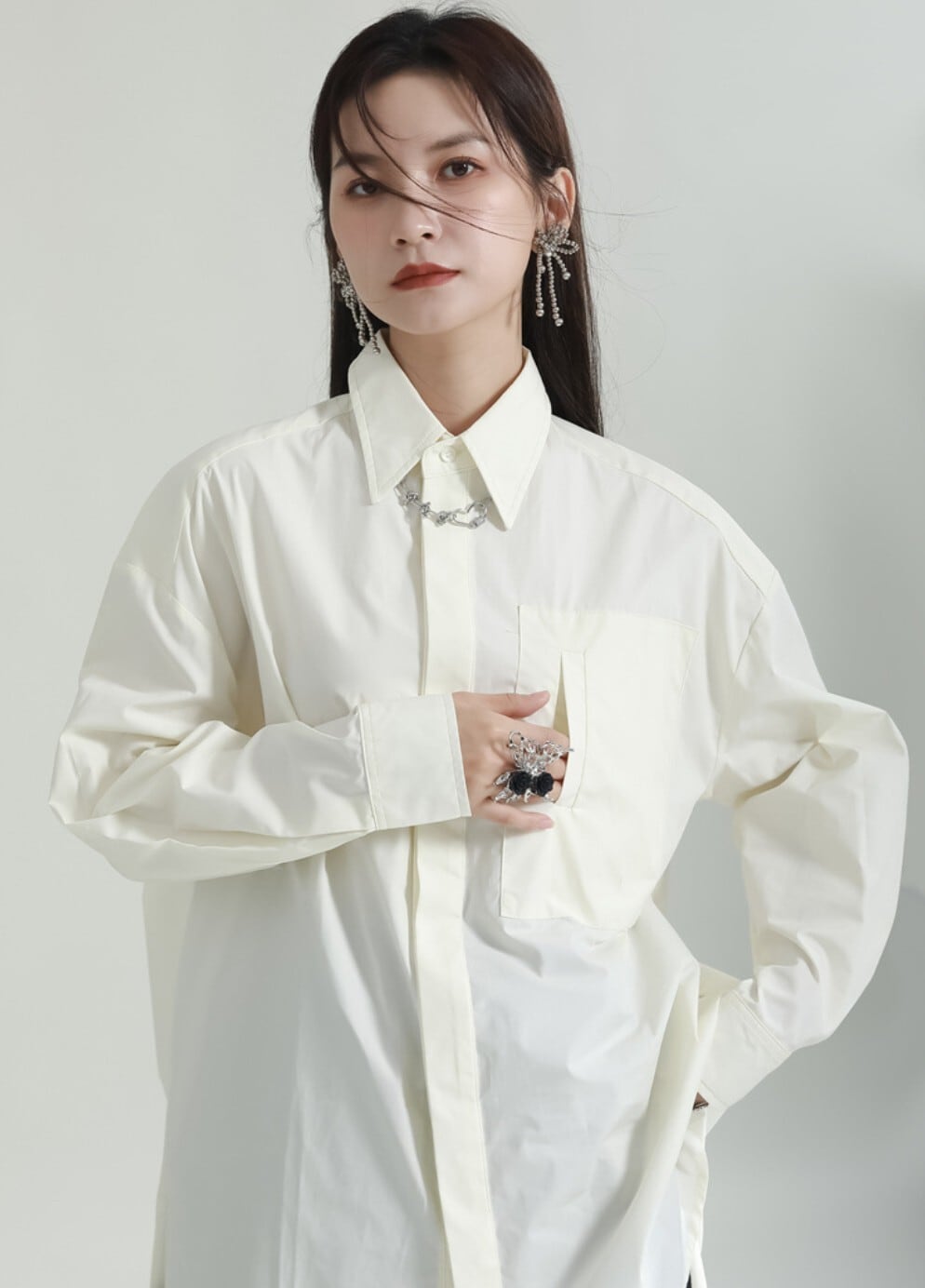 前後差のある丈感が特徴の、オーバーサイズロングシャツ。