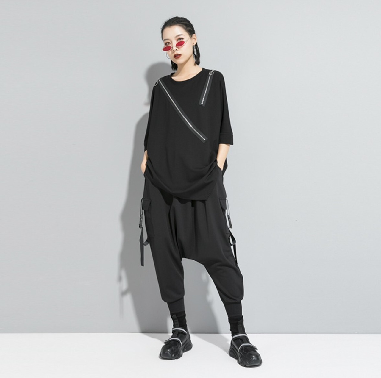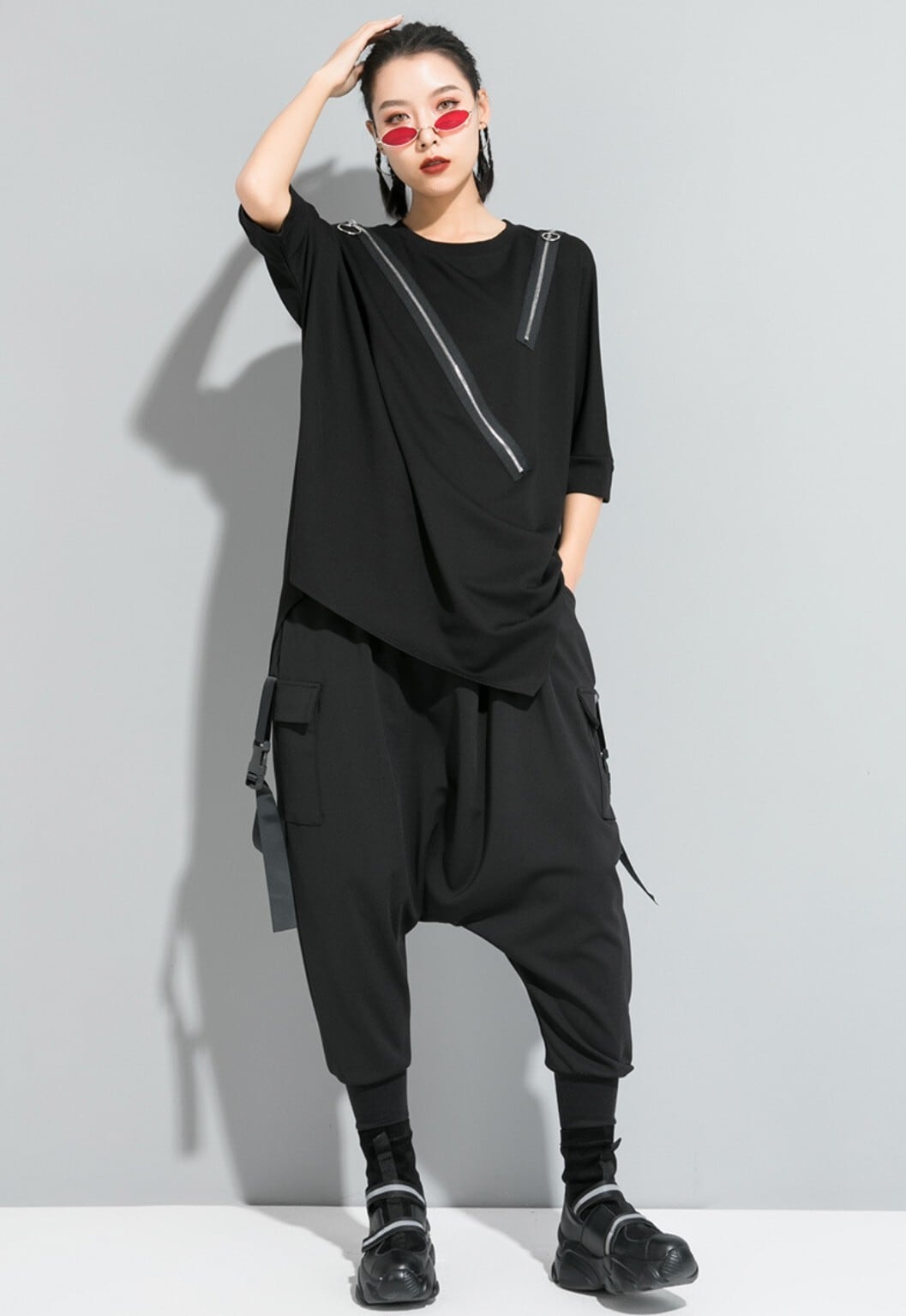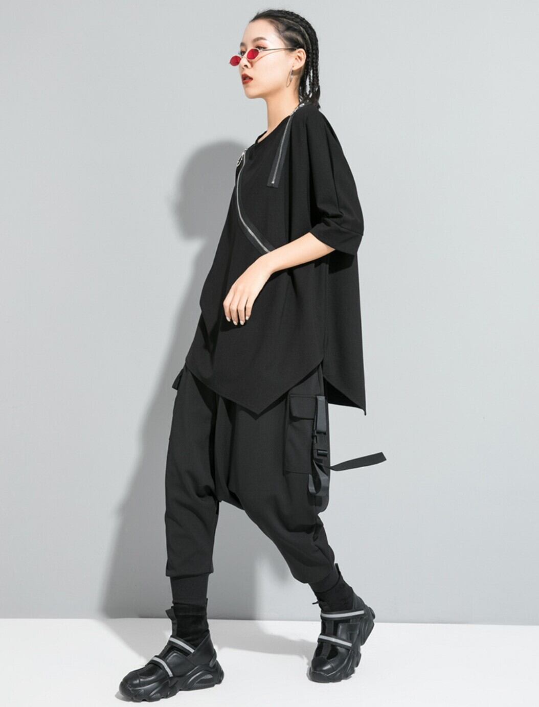 【即発送/送料無料】ダブルジップ アシンメトリー五分袖トップス ブラック / 韓国モード